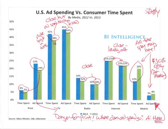 The chart demonstrates that most channels are reasonably aligned in time spent vs advertising dollars. So it’s clear that the dollars will flow largely from print to mobile. That’s what’s out of whack. Yes, you can argue that the time spent with print is of higher quality than looking at cat videos on your mobile device. But even if print time is double in value, then 10 percentage points of advertising still has to flow somewhere.